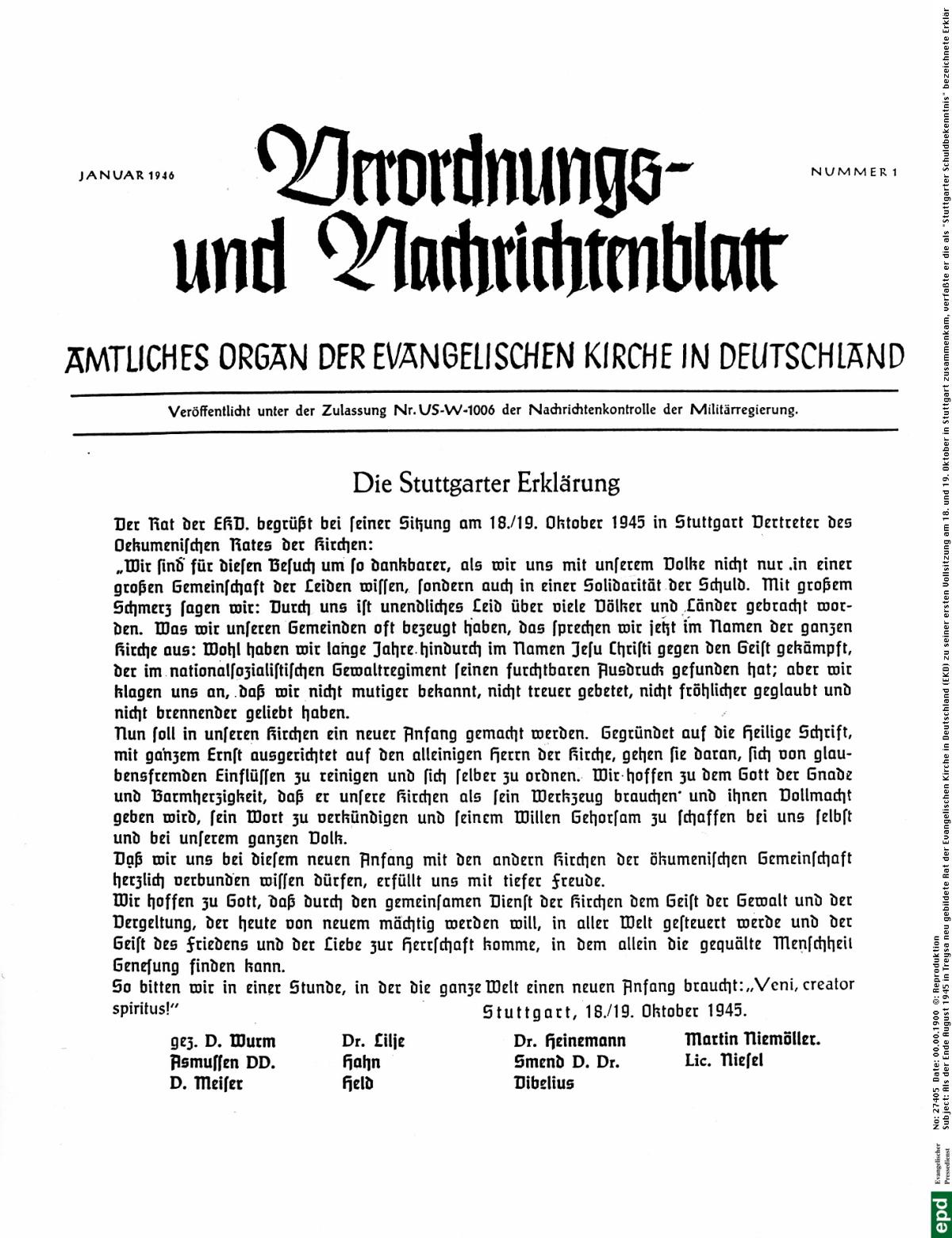 Als eine „bleibende Mahnung für Christinnen und Christen“ hat die Vorsitzende des Rates der EKD, Bischöfin Kirsten Fehrs, die Stuttgarter Schulderklärung bezeichnet, die am 19. Oktober 1945 der Rat der EKD vor Vertretern des Ökumenischen Rats der Kirchen abgegeben hat.