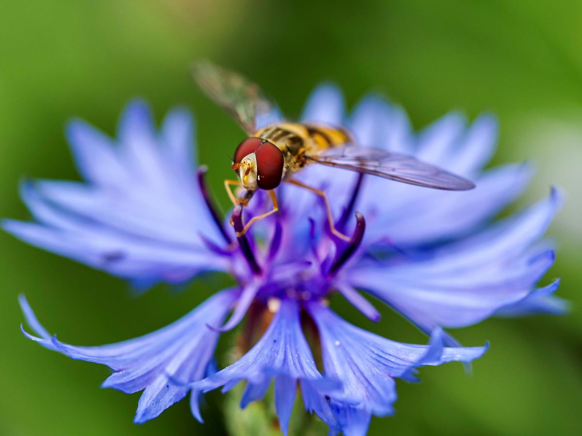 Foto: Das Siegerfoto des VIA Natura-Fotowettbewerbs 2025 in der Kategorie Nahaufnahme „Hainschwebfliege an Kornblume“ ist auch in der Ausstellung zu sehen.
