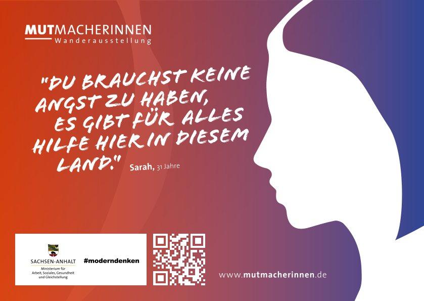 Unter dem Titel „Mutmacherinnen – Wege aus der Gewalt“ ist in der Marktkirche in Halle vom 6. bis 21. November eine Ausstellung zum Thema Gewalt gegen Frauen zu besichtigen. Auf den Schautafeln erzählen acht Frauen ihre Geschichte der Gewalterfahrung und ihres Neuanfangs in der Hoffnung, andere betroffene Frauen zu bestärken, Schutz und Unterstützung zu suchen.